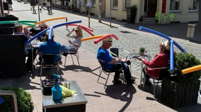 Тримати дистанцію у закладах харчування, це перший і ключовий захід безпеки в ці дні. Тому одна із кав'ярень німецького містечка Шверин знайшла вихід: відвідувачам літньої тераси почали видавати солом'яні капелюхи з прикріпленими до них поролоновими палицями для басейнів. Такі імпровізовані головні убори не дають наближатись один до одного більш ніж на дозволені 1,5 м.