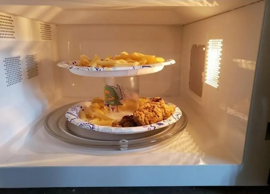 Досить часто нам потрібно розігріти у мікрохвильовці їжу для себе, а також для друга чи члена сім'ї. У такому випадку не варто це робити поступово та у два етапи. Краще спочатку відправте одну тарілку з їжею у мікрохвильовку, в її центрі поставте чашку з невеликою кількістю води. На чашку поставте другу тарілку з їжею. Увімкніть мікрохвильовку на потрібний режим. Завдяки такому лайфхаку дві людини одночасно зможуть їсти однаково нагріті страви.
