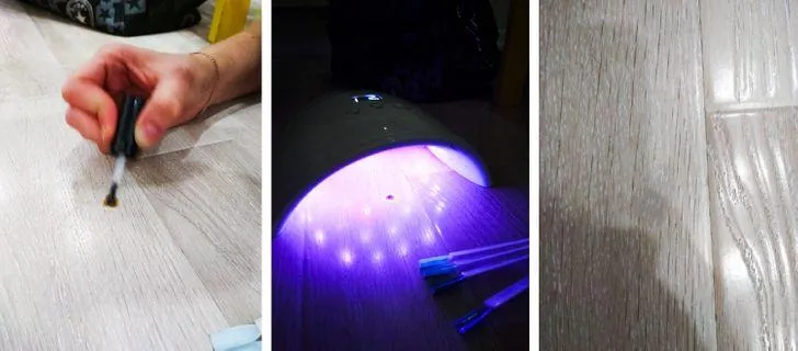 Пошкоджену підлогу можна швидко відновити гелем для нігтів. Оберіть правильний колір, нанесіть на поверхню, висушіть і вуаля.