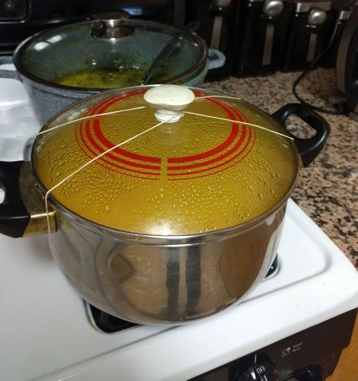 На завершення: лайфхак для всіх любителів перших страв. Щоб не розлити суп, коли ви будете ставити чи витягати його з холодильника, прикріпіть кришку гумкою.