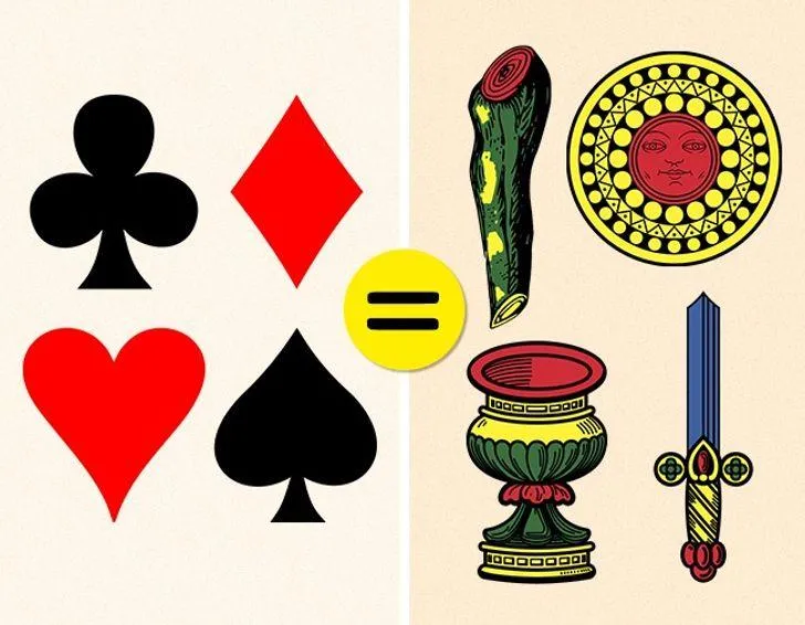 Чому саме ці символи потрапили на карти достеменно невідомо. Гральні карти прийшли в Європу з Китаю. Можливо, там ці предмети позначали різні стани: дворянство (жезли), духовенство (кубки), торговців (монети) і військових (мечі).