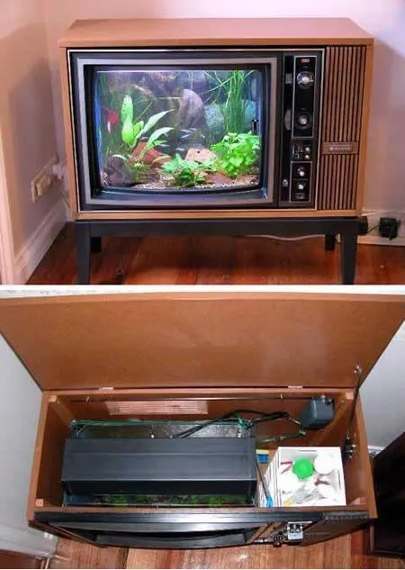 Ваш старий телевізор може стати стильним та оригінальним акваріумом для рибок. Витягніть все непотрібне з середини, а натомість поставте туди скляний куб із водою.