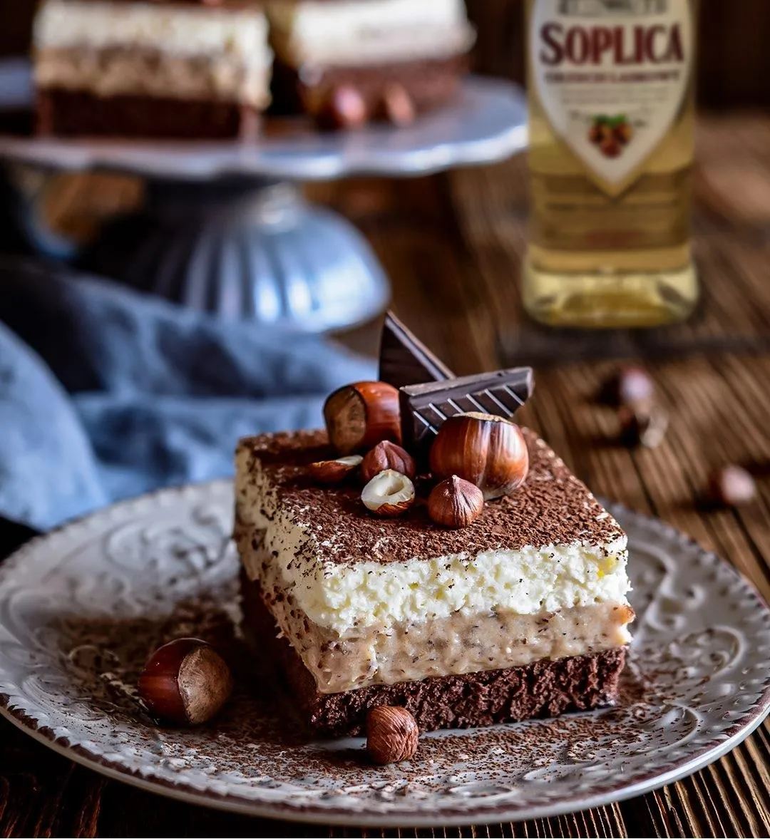 Вишуканий торт з мусом із білого шоколаду зачарує насиченим ароматом запашної кави та Soplica Orzech Laskowy.