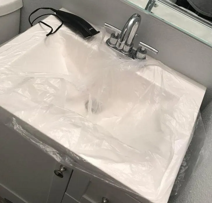Прибирання у ванній кімнаті після гоління може зайняти багато часу. Щоб не повторювати ці дії щоразу, просто застеляйте умивальник пакетом. Після гоління швидко зберіть все і викиньте у смітник.