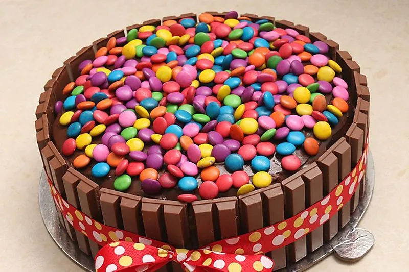 Ваш тортик вийде дуже яскравим, якщо його повністю покрити драже. Використовуйте для цього кульки різних кольорів.