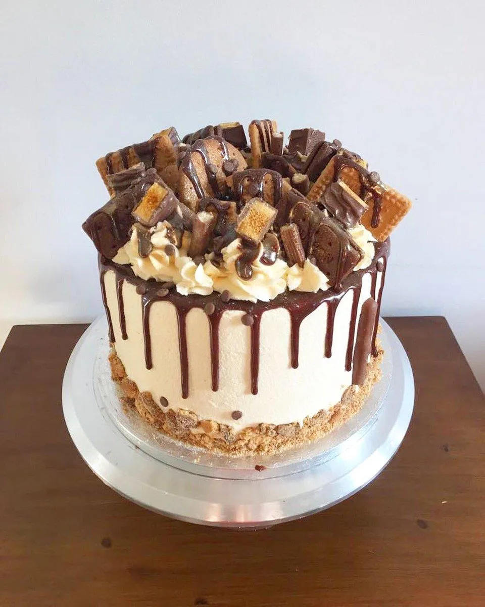 Ідеї у фото, як прикрасити торт печивом та батончиками