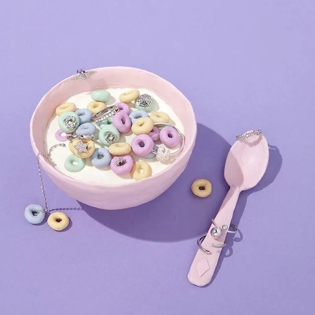 Ці рекламодавці пропонують на сніданок разом із пластівцями "покуштувати" прикраси. Вони додали ювелірні вироби у тарілку з молоком, а також задекорували ними ложку.