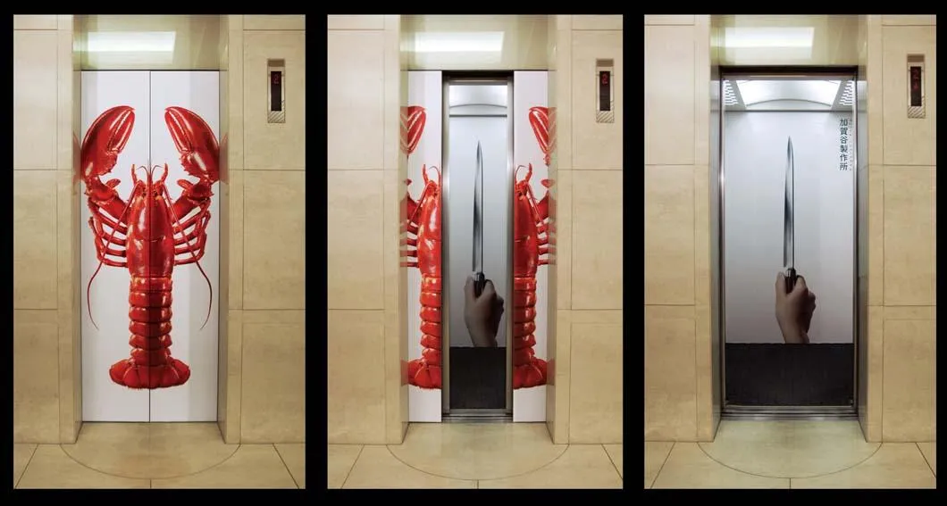 9. Реклама ножів Kagatani Knife на дверях та всередині ліфта