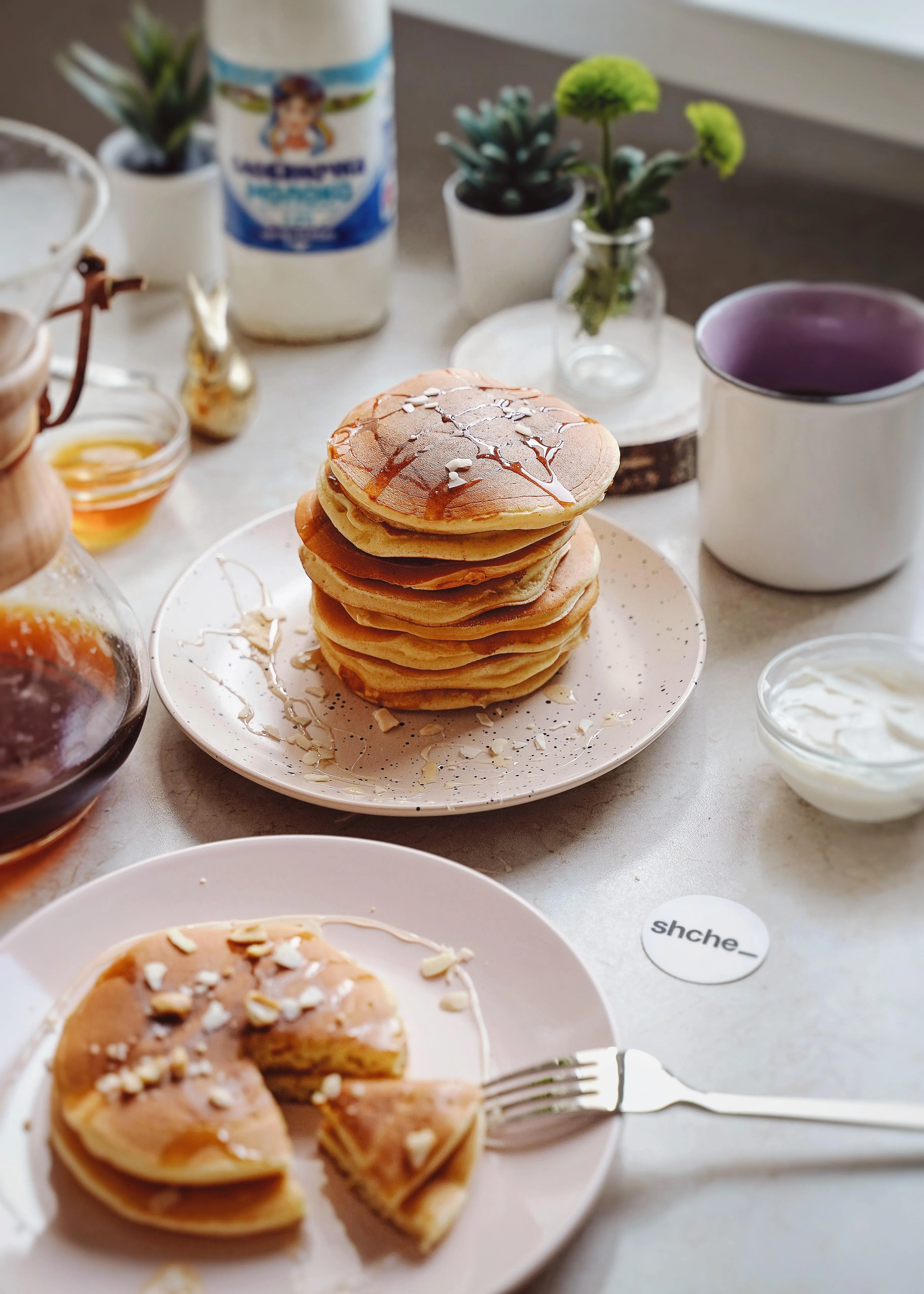 Готуйте млинці на пательні з обох сторін до золотистої скоринки. Перед подачею приправте кленовим сиропом, медом чи улюбленим варенням. Можете також додавати кокосову стружку або мигдальні пластівці.