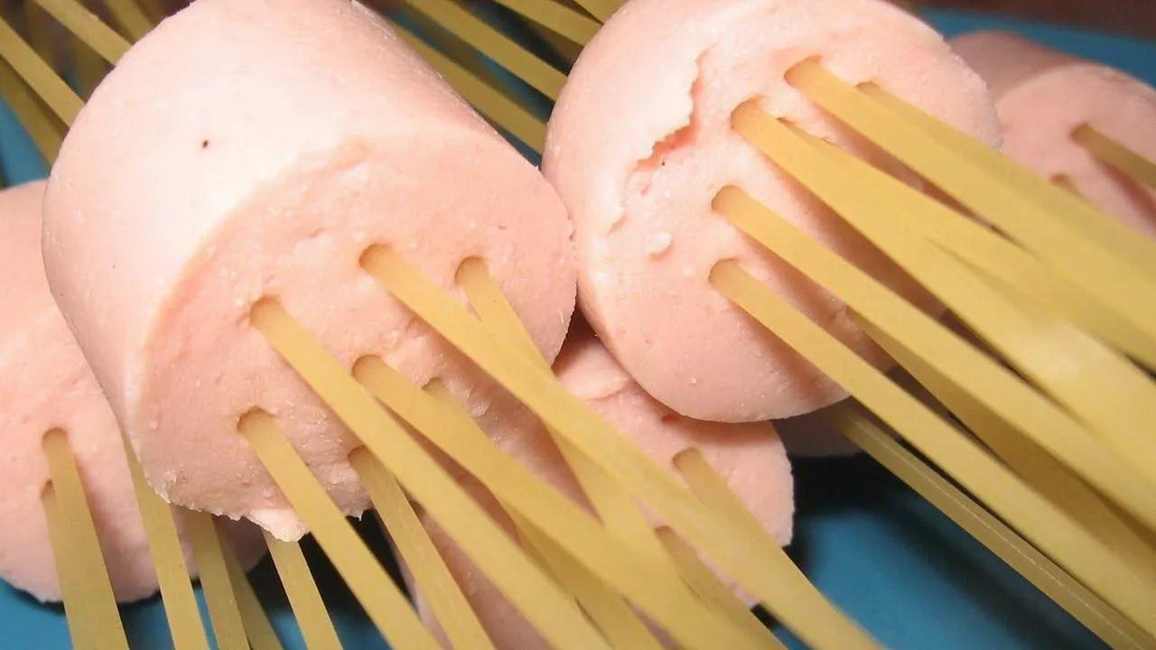 - Кожну четвертину сосиски простромлюємо сухими спагеті (як показано на фото нижче).
