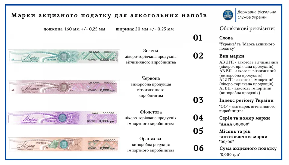 На легальному алкоголі акцизна марка завжди клеїться в одному й тому самому місці таким чином, щоб під час відкривання пляшки вона розірвалась. Акцизні марки мають свій колір, який відповідає виду горілчаного напою. Нижче наведена таблиця, в якій вказана загальна необхідна інформація про те, як мають виглядати акцизні марки в Україні та які реквізити вони повинні містити.