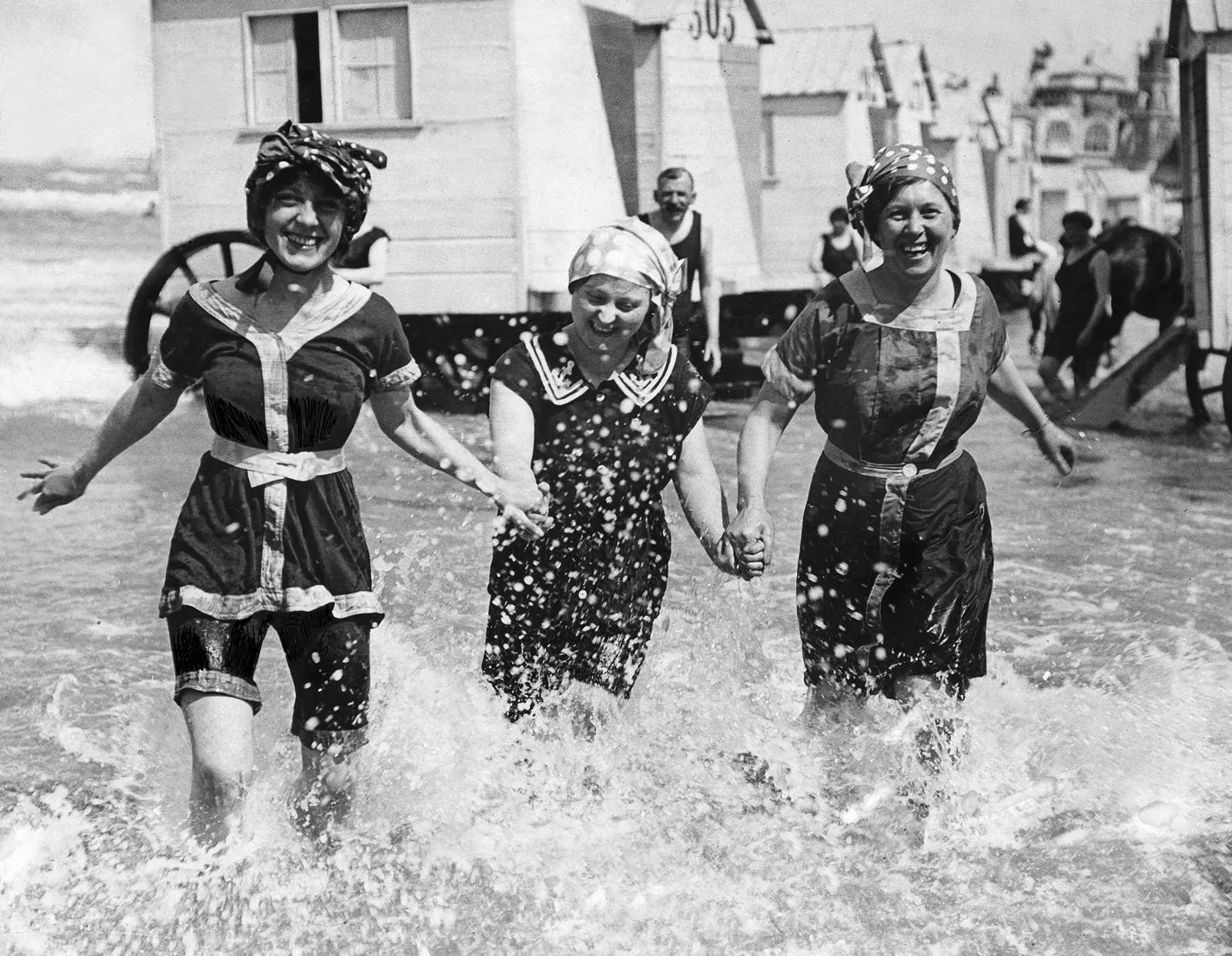 Група жінок біжить по воді, позаду них пляжні фургони для переодягання, 1914 рік / Фото BuzzFeedNews