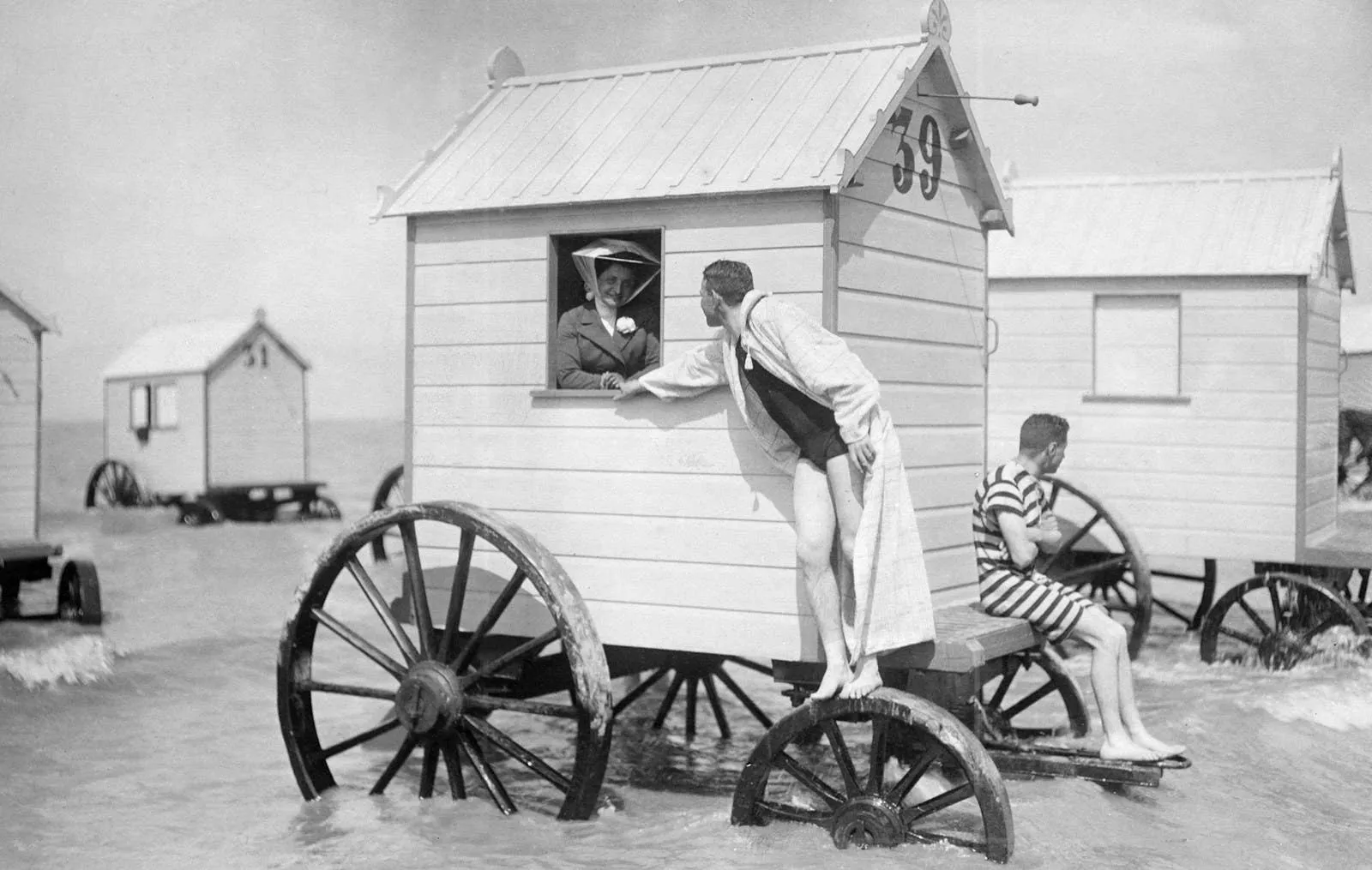 Дами плескалися на березі, бризкалися, присідали, обливалися водою. Після цього, переодягнувшись в щось біле, вони сиділи далеко від води в орендованих плетених кабінках, шезлонгах або під парасолькою, і дихали цілющим морським повітрям.