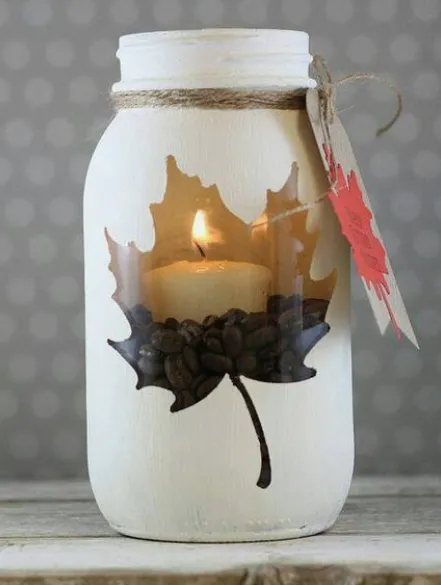 Використайте трафарет та фарбу будь-якого кольору. Малюнок, що залишився не зафарбованим, послужить "віконечком" для яскравого сяйва. Засипте всередину кавові зерна та поставте в них свічку.