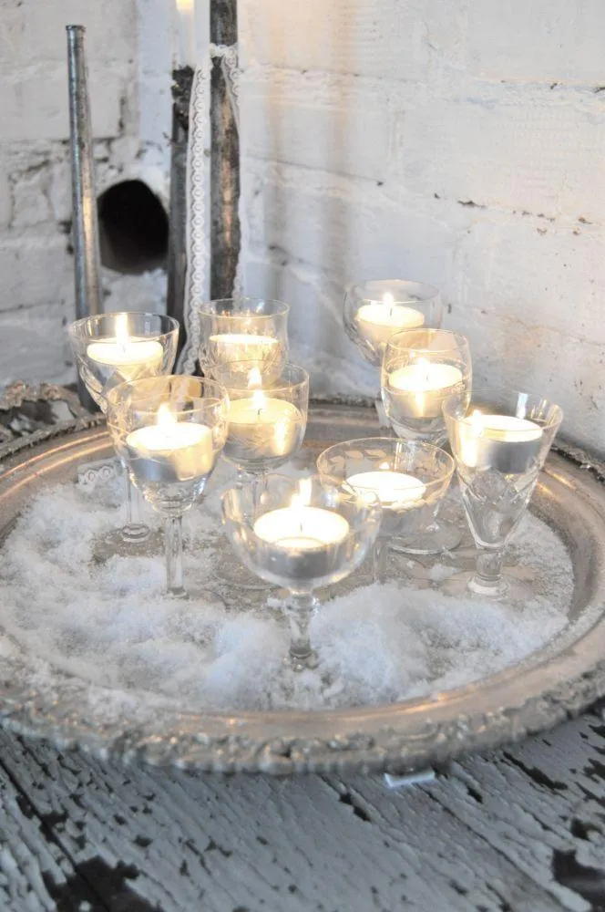 Краса у простоті, чи не так? Дістаньте з шафи старі келихи, розставте їх у хаотичному порядку на піднос, покладіть всередину свічки та злегка "припорошіть снігом" з аерозолю. Вуаля!