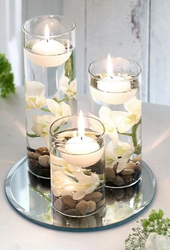 Неймовірно естетичний декор, в основі якої прозора ваза, каміння, вода, квітка й свічка. Найкраще обрати вази різної висоти, розгляньте також скошені верхівки. Таким чином у вас вийде ефектна асиметрична композиція.