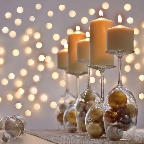 Виявляється, келихи можна використовувати не лише за прямим призначенням. Усе просто: наповніть їх обраними прикрасами, переверніть догори дриґом та поставте зверху свічки. Такий спосіб декорування безперечно заслуговує на увагу.