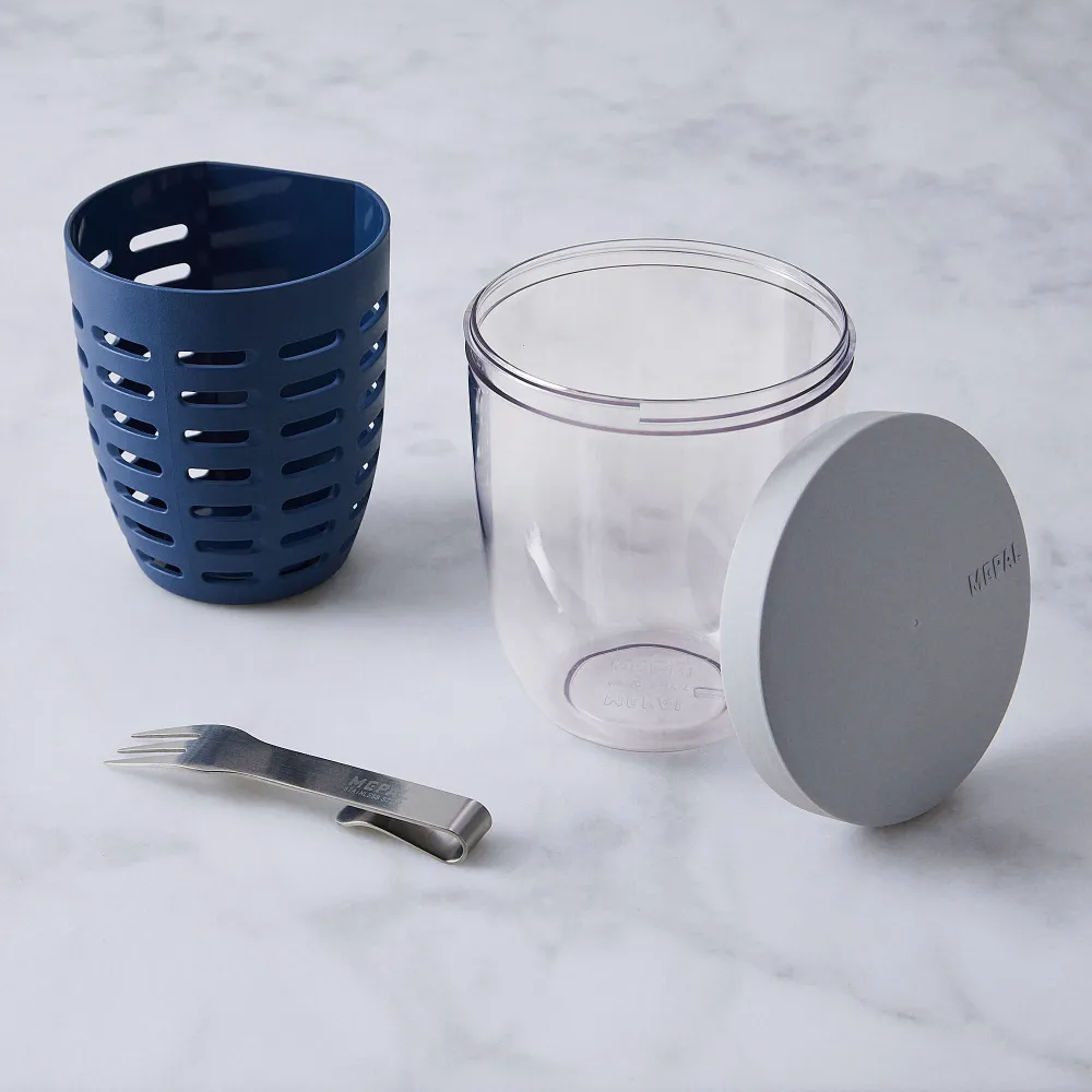 Посуд, завдяки якому можна швидко помити фрукти чи ягоди, а потім взяти їх з собою на роботу чи в дорогу. Ємність складається з двох циліндрів, кришки та маленької виделки.