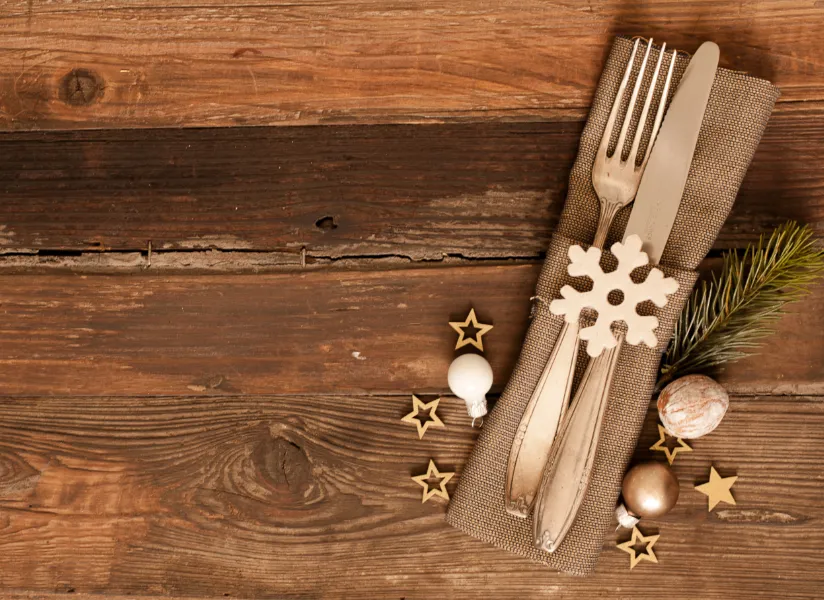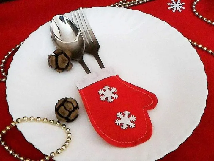 4. Декор столовых приборов с использованием елочных игрушек и лент
