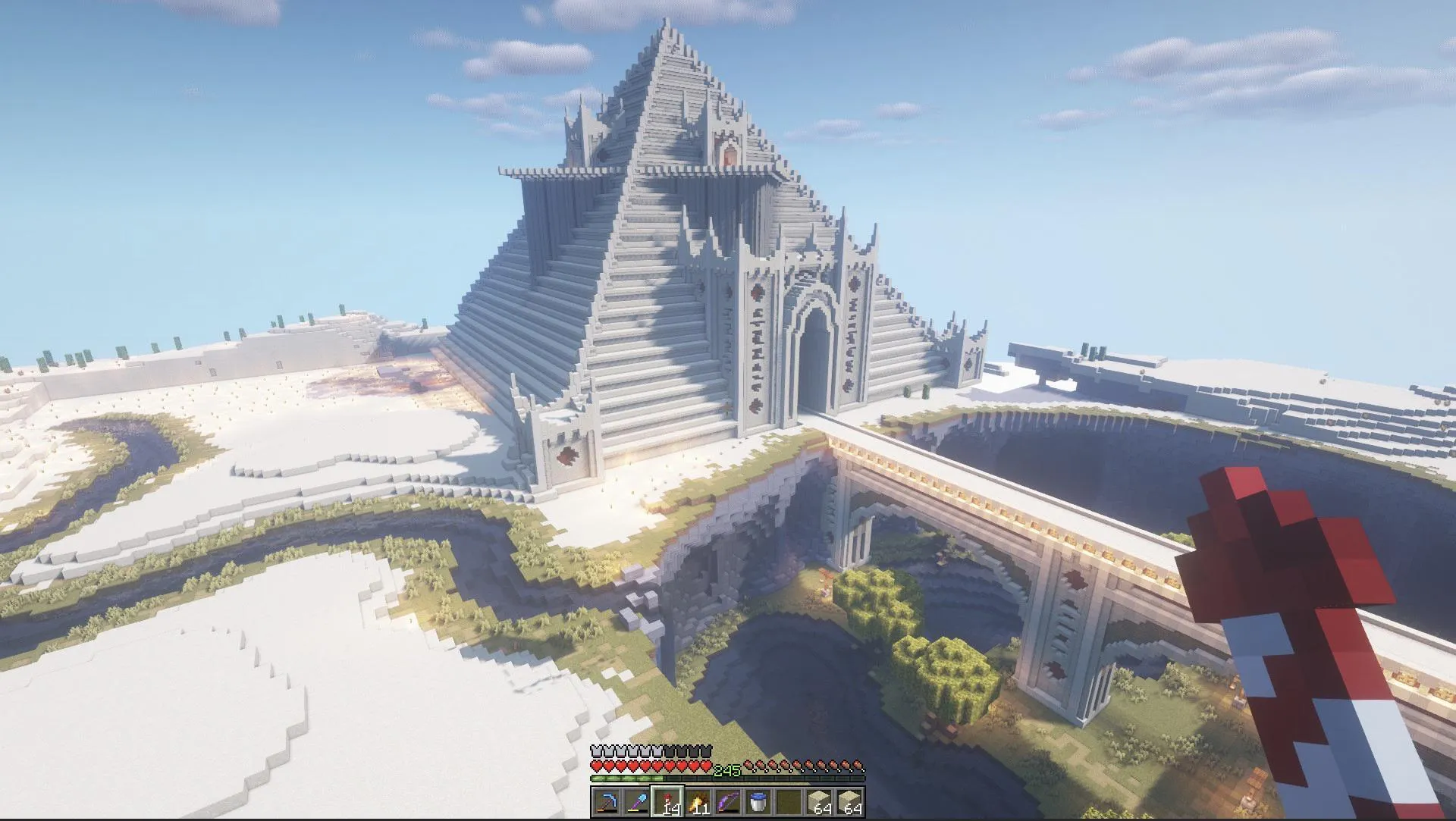 Пустынный биом трудно назвать любимцем игроков. Однако есть способы сделать его гораздо более приятным, если вы готовы к вызовам. OnTheSpotLive был готов и построил невероятную базу внутри гигантской пирамиды. Еще более удивительной ее делает собственноручно созданный ландшафт вокруг с собственной рекой и водопадом, а также огромный помпезный мост.