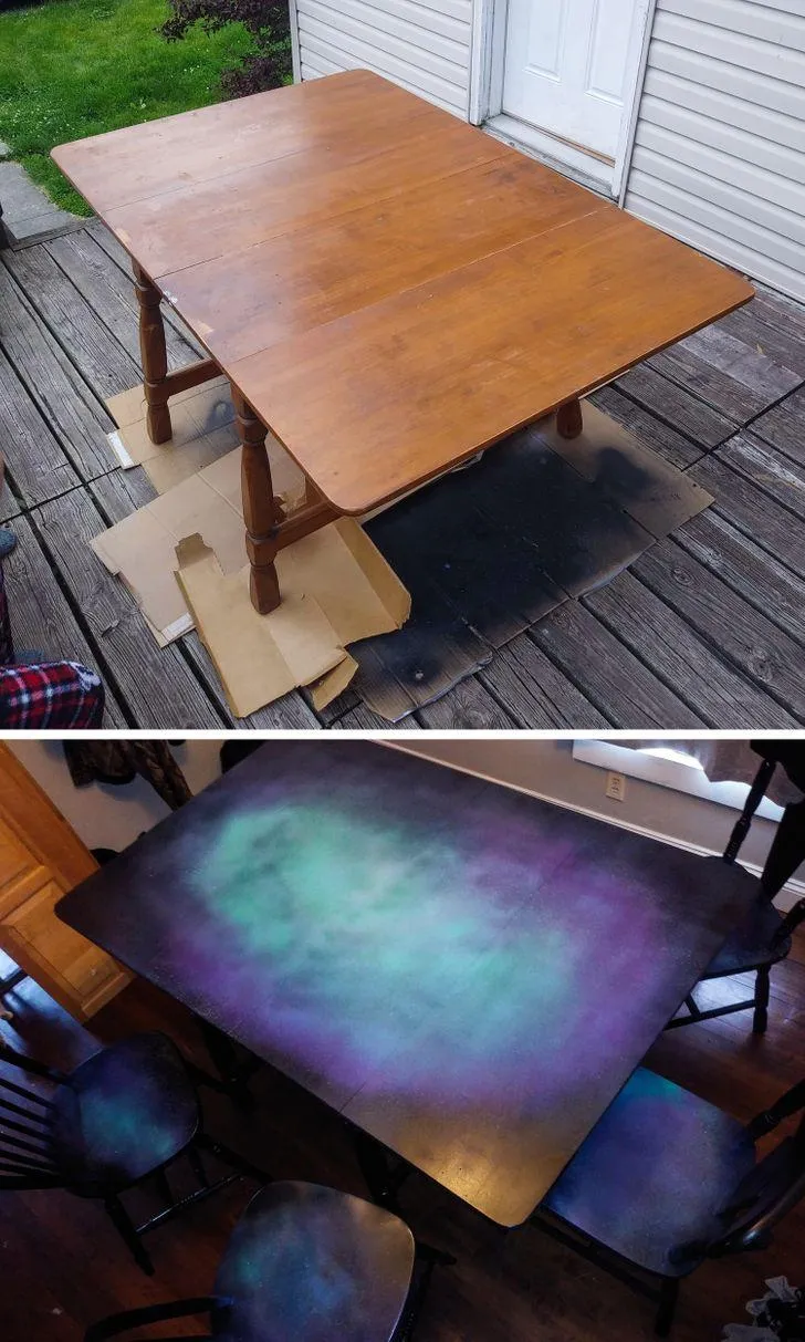 3. "Помог другу с ремонтом кухонного стола и стульев. Дизайн, выполненный аэрозольной краской Galaxy, вышел суперкрутым!"