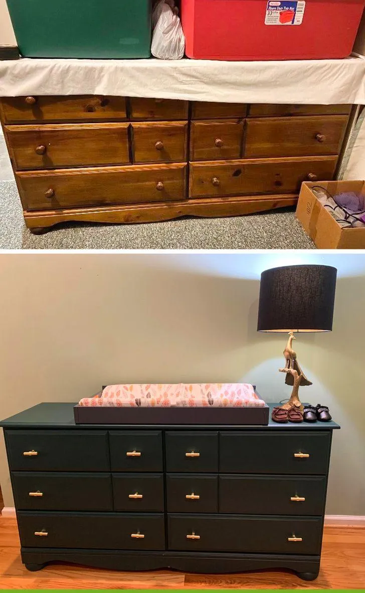 4. "Мой комод за 10 долларов" до "(слева) и "после" (справа). Впервые красил методом напыления. Я очень доволен результатом, ведь потратил на материалы только 40 долларов"