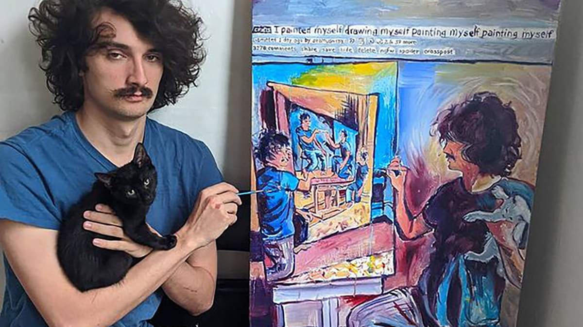 Живописец снова нарисовал себя и сфотографировался рядом, держа котенка.
