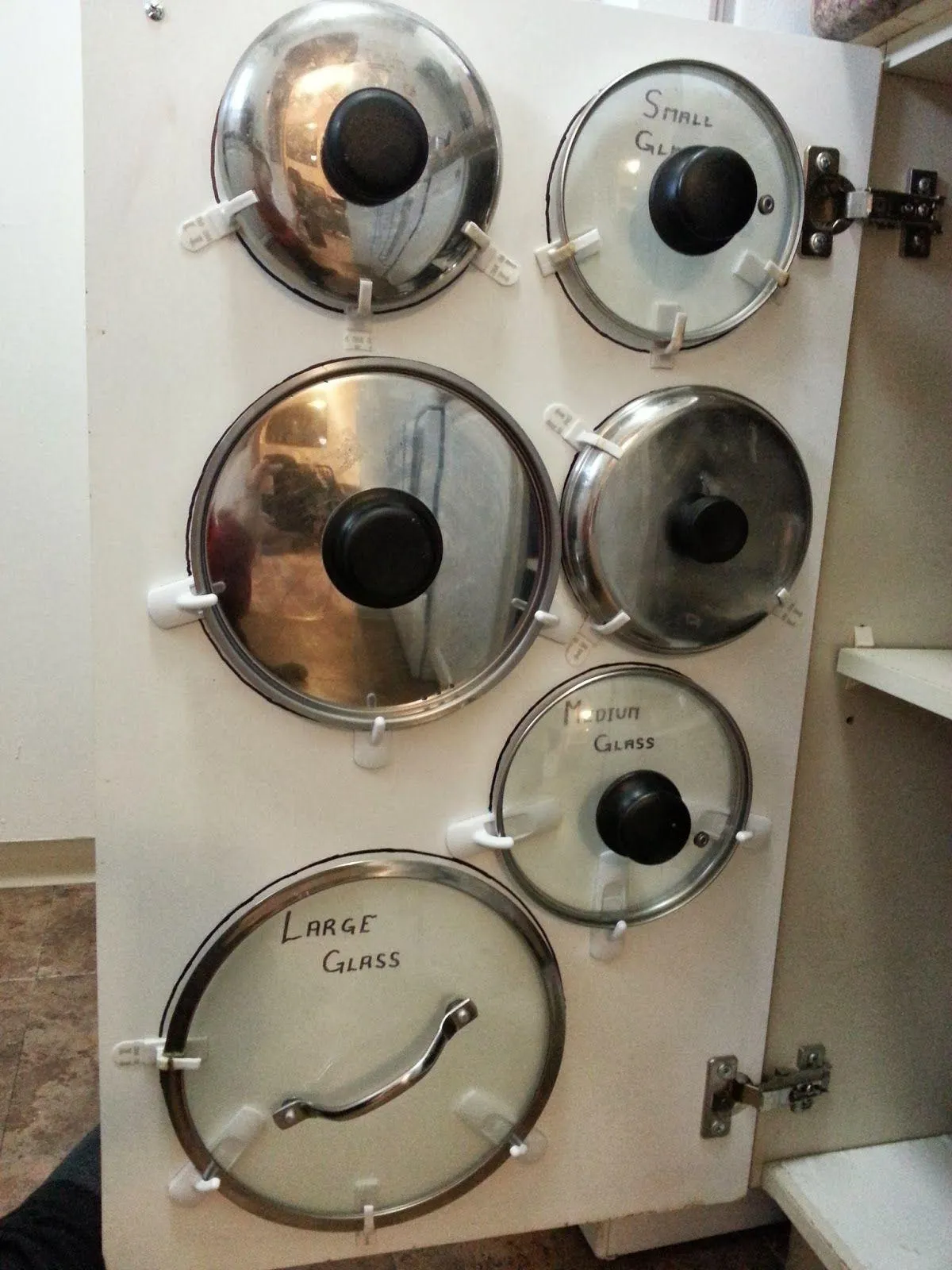 Для того чтобы рационально использовать все пространство, приобретите крючки на присосках. Фиксируя их на дверце тумбочек, вы сможете создать идеальное место для крышек от кастрюль.