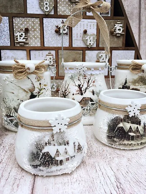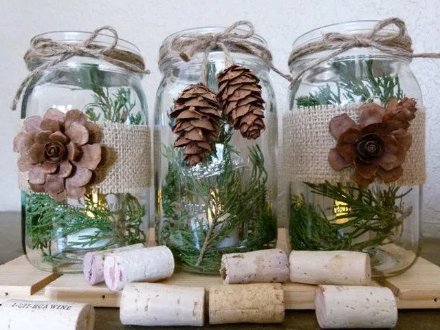 5. Баночки, украшенные шишками и веточками сосновых деревьев