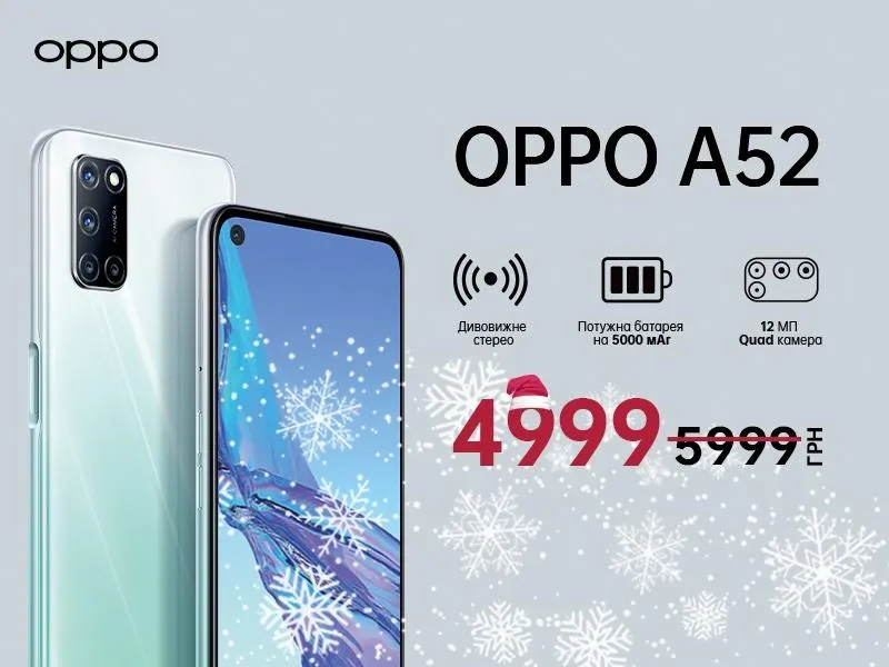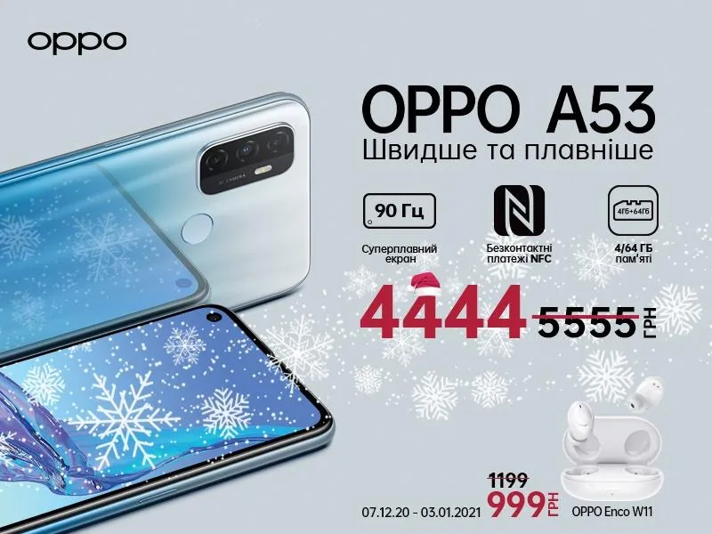 Наприклад, провідний світовий виробник розумних гаджетів ОРРО до новорічних свят оголосив знижки на найпопулярніші моделі. Серед них бестселер А серії ОРРО А53. Він може похвалитися IPS-дисплеєм, який підтримує частоту оновлення зображення 90 Гц і частоту дискретизації сенсорного екрана до 120 Гц, що гарантує плавну роботу.