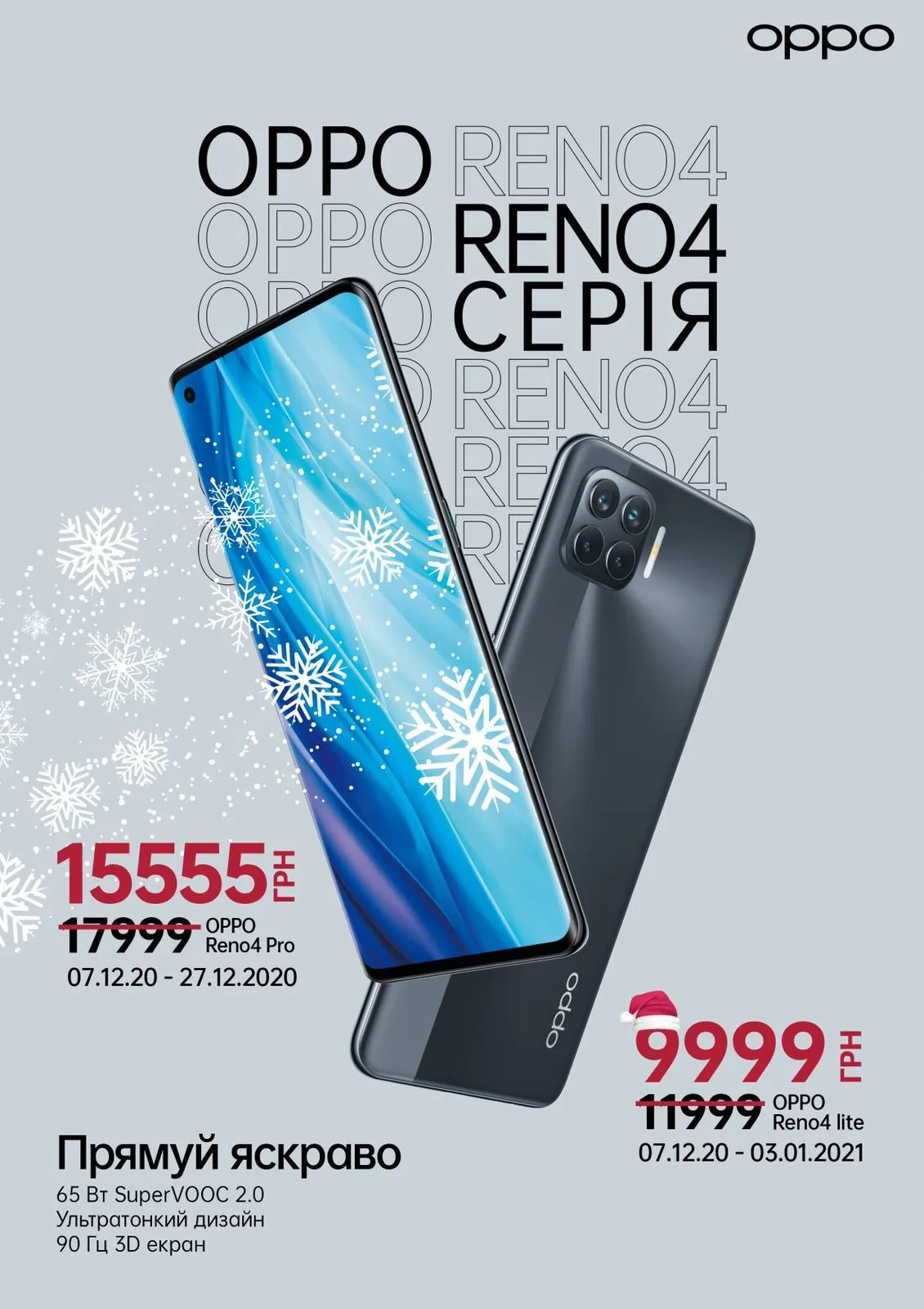 Поціновувачам преміальної якості ОРРО приготували знижки на нову Reno4 серію, представлену смартфонами Reno4 Pro та Reno4 Lite. Якщо шукаєте для подарунка гаджет зі стильним дизайном і відмінним користувацьким інтерфейсом, Reno4 Pro – ідеальна знахідка. Ця модель з 90 Гц дисплеєм потішить ваші зорові та тактильні відчуття. А широко відома технологія швидкої зарядки SuperVOOC 2.0 потужністю 65 Вт змусить вас здивуватися тому, наскільки зручним і швидким може бути процес заряджання телефона.