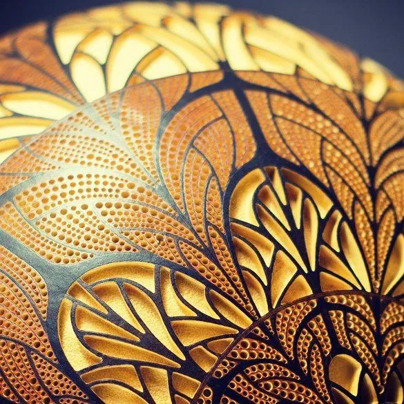 - Закінчивши різьблення, починається етап свердління. Щоб досягти найкращих можливих світлових ефектів, кожен отвір повинен бути просвердлений точно в напрямку джерела світла. У більших торшерах кількість отворів може становити майже 30 тисяч.