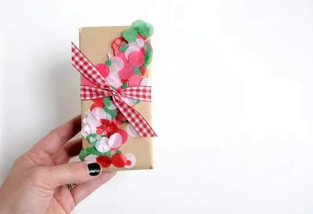Обгорніть подарунок коричневим крафт-папером та закріпіть скотчем. Нанесіть тонкий шар клею та посипте зверху конфеті. Їх ви можете купити або зробити самостійно з кольорового паперу.