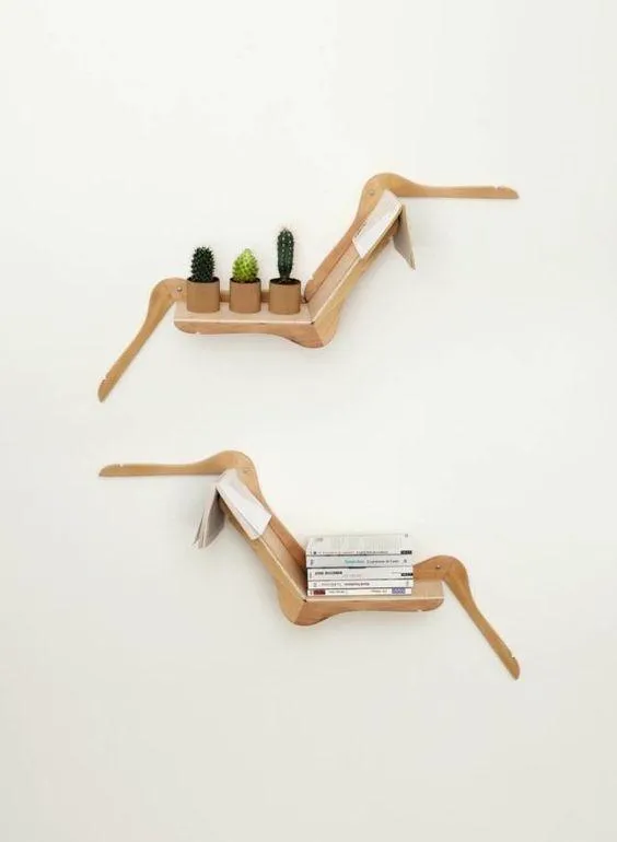 Для того, щоб зробити такі настінні полички, необхідно 3 вішаки та дерев'яна дошка. Крім того, дерево у сучасному декорі виглядає дуже ефектно.