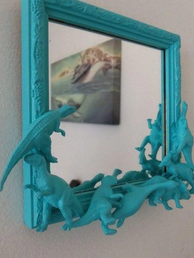 Якщо маєте декілька однакових іграшок, можете використати їх для декору дзеркала. Для цього в ідеалі потрібно пофарбувати і рамку, і самі іграшки в однаковий колір.