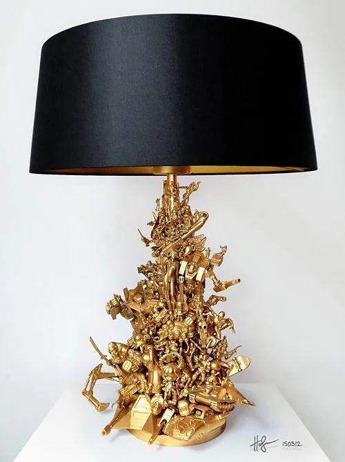 За допомогою невеликих дитячих іграшок ви можете перетворити стару лампу у вишукану дизайнерську річ інтер'єру. Для цього варто усі невеликі іграшки приклеїти до підставки лампи, а потім пофарбувати у вдалий колір.