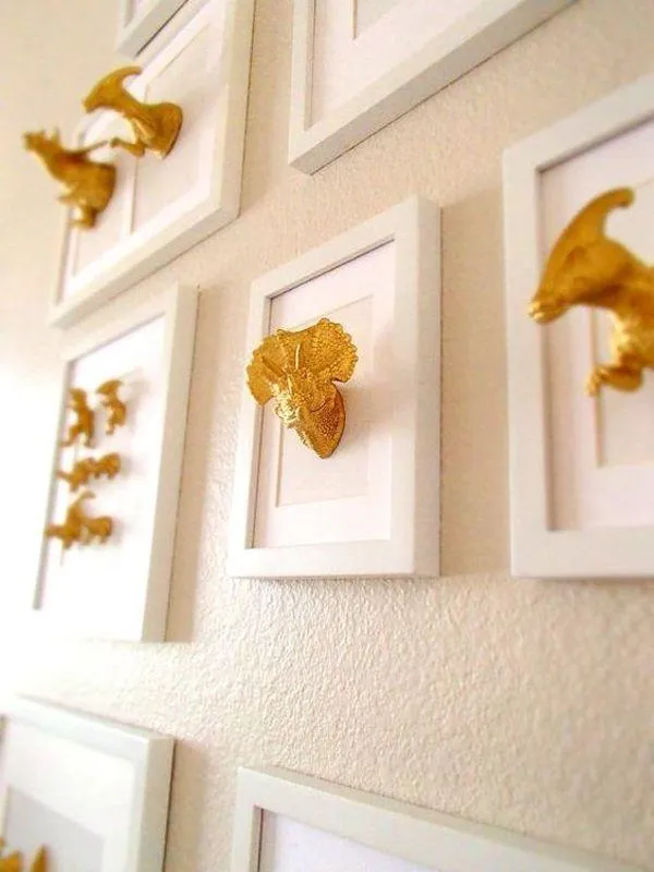 Зі старих іграшок можна створити незвичні картини в дитячу кімнату. Для цього варто купити гіпсокартон чи пінопласт, вирізати з них рамку, приклеїти іграшки та все ретельно пофарбувати у найбільш вдалі кольори. Діти будуть в захваті від такої креативної картини.