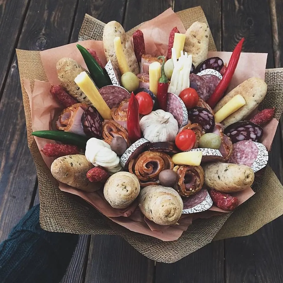 Живі квіти – це завжди емоції. Але ми маємо на увазі створення класних "букетів" з фруктів, м'ясних та сирних продуктів, солодощів, а також з додаванням певних напоїв. Ідея не нова, але ви можете вразити оригінальністю та дещо нижчою від "ринкової" ціною.