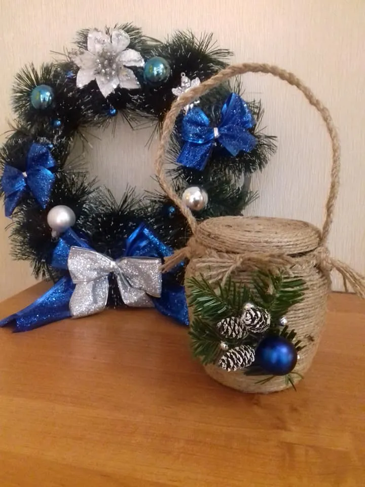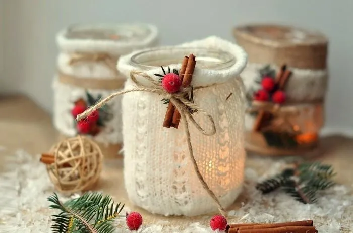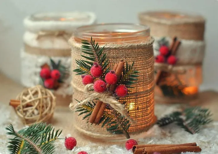 5. Баночки, прикрашені шишками та гілочками соснових дерев