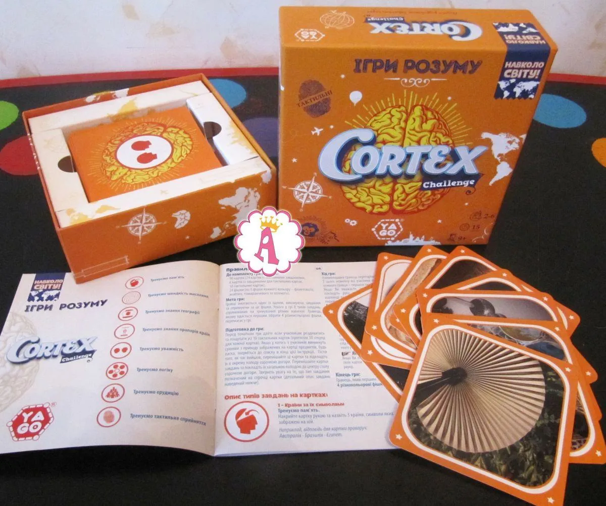 Cortex підходить і для великої компанії, і для 2 гравців. Правила досить прості. Гра буде цікава як дітям, так і дорослим. Вона розвиває швидкість мислення, логіку, пам’ять, координацію та математичні навички.