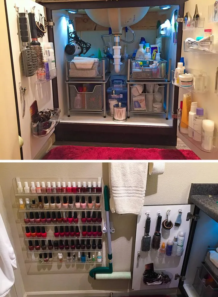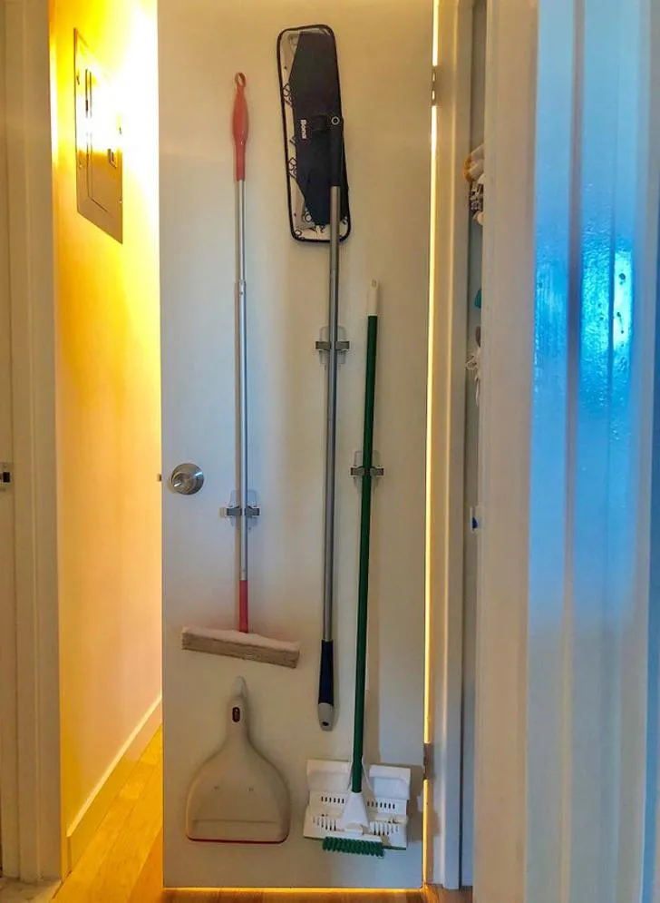 Якщо у вас маленька квартира і ви не знаєте, куди сховати речі для прибирання, – закріпіть їх на гачках або поличках, прикріплених до дверей. Усе буде виглядати красиво та акуратно, а у вас з'явиться додатковий вільний простір.