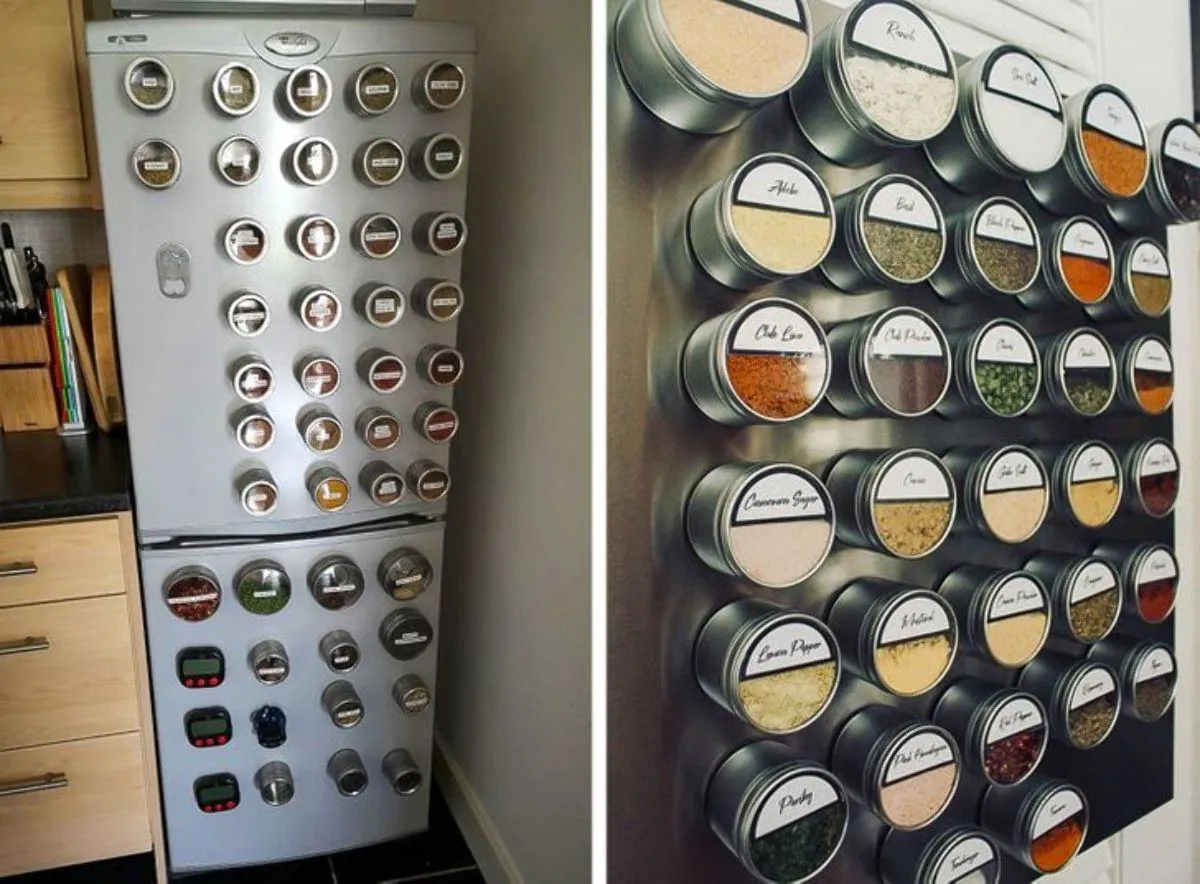 Якщо ви обожнюєте готувати, то у вас точно багато різноманітних спецій. Вони, як правило, займають багато вільного місця на поличках. Замість цього використайте магнітні баночки зі спеціями. Вони красиво й оригінально будуть виглядати на вашому холодильнику. Окрім цього, ви завжди зможете знайти потрібну приправу за лічені секунди.