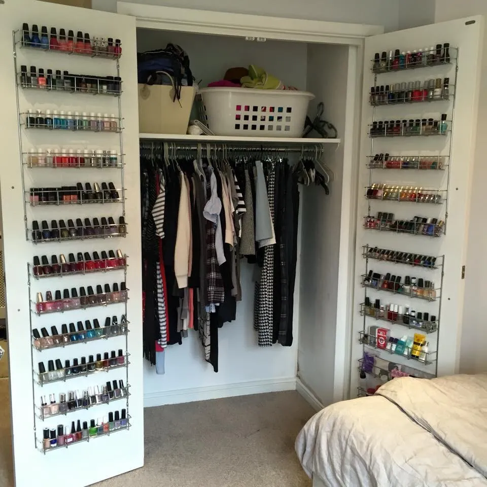 Для тих, хто має велику кількість лаків, кремів, губних помад, ременів та інших дрібних деталей, можна зробити мініполички на дверях шафи. Це практично та зручно.