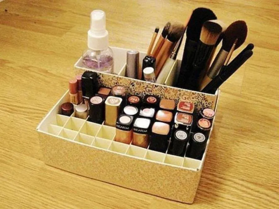 Упорядкуйте свою косметику. Поділіть на категорії, акуратно поскладайте. А для пензликів для макіяжу можете використати будь-які склянки чи банки. За бажанням їх можна задекорувати.