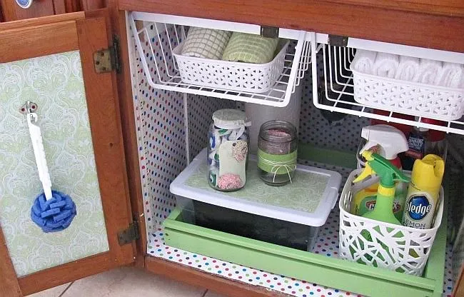 Для цього варто розмістити усі прибиральні засоби в одному місці. Або звільніть для цього цілу полицю, або придбайте спеціальний ящик.