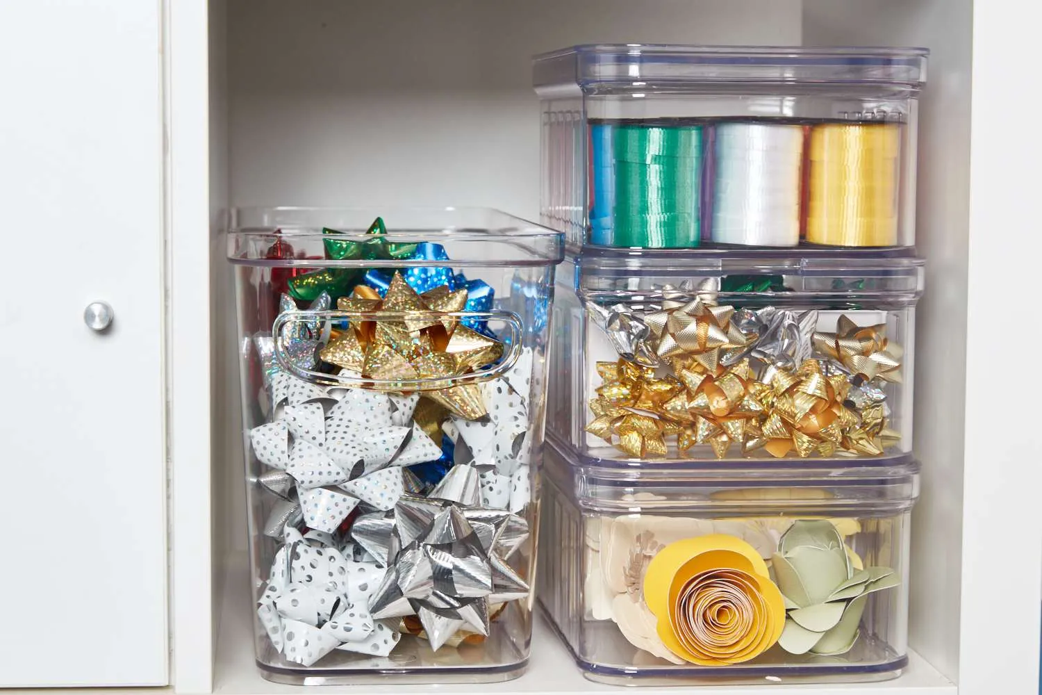 Якщо ви зберігайте різні декоративні елементи (стрічки, ґудзики, обгортковий папір та інше), розділіть речі на певні категорії і поскладайте в різні контейнери.