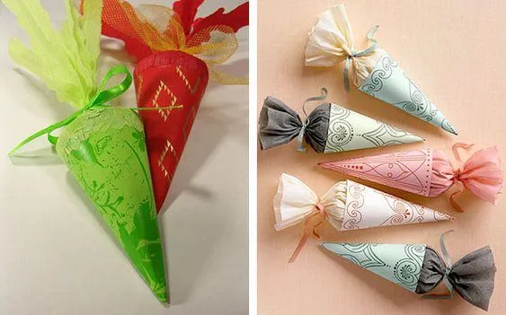 - У центр покладіть ваш подарунок без коробки, з'єднайте 2 кінці паперу з протилежних сторін, формуючи конус.