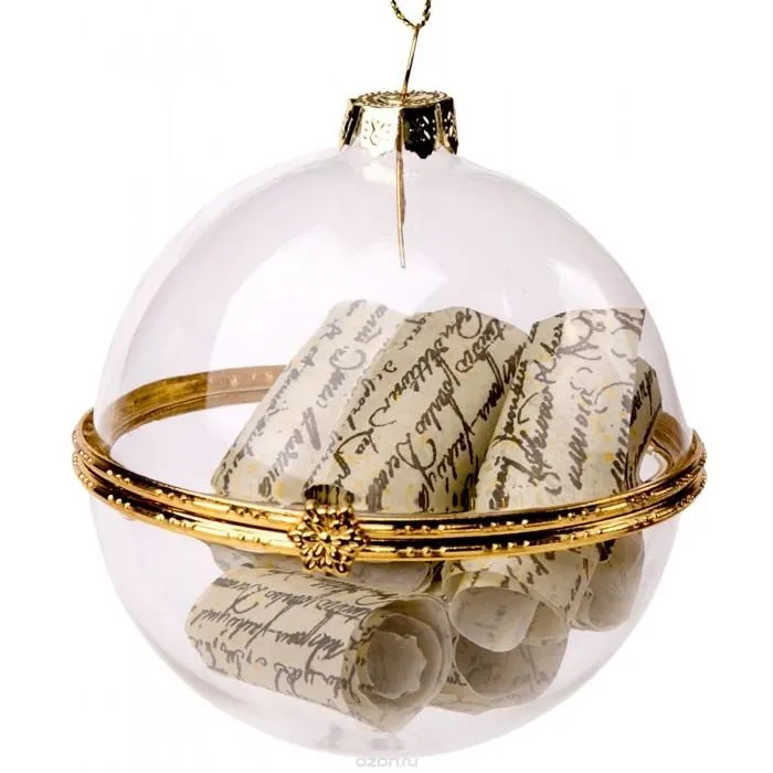 Купіть нову ялинкову іграшку у вигляді кулі. На маленькому аркуші паперу запишіть заповітні бажання і сховайте аркуш в іграшку. Прикрасьте ялинку і щоденно по 5 хвилин тримайте кульку в руці. Через тиждень іграшку зніміть і заховайте в таємне місце. Чекайте здійснення вашого бажання.