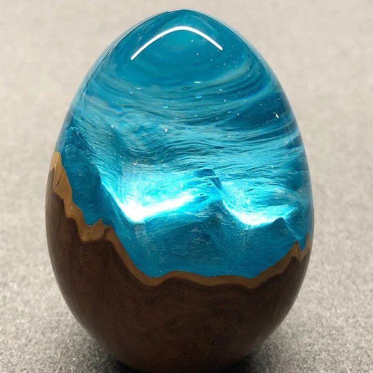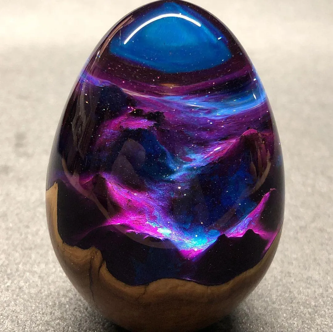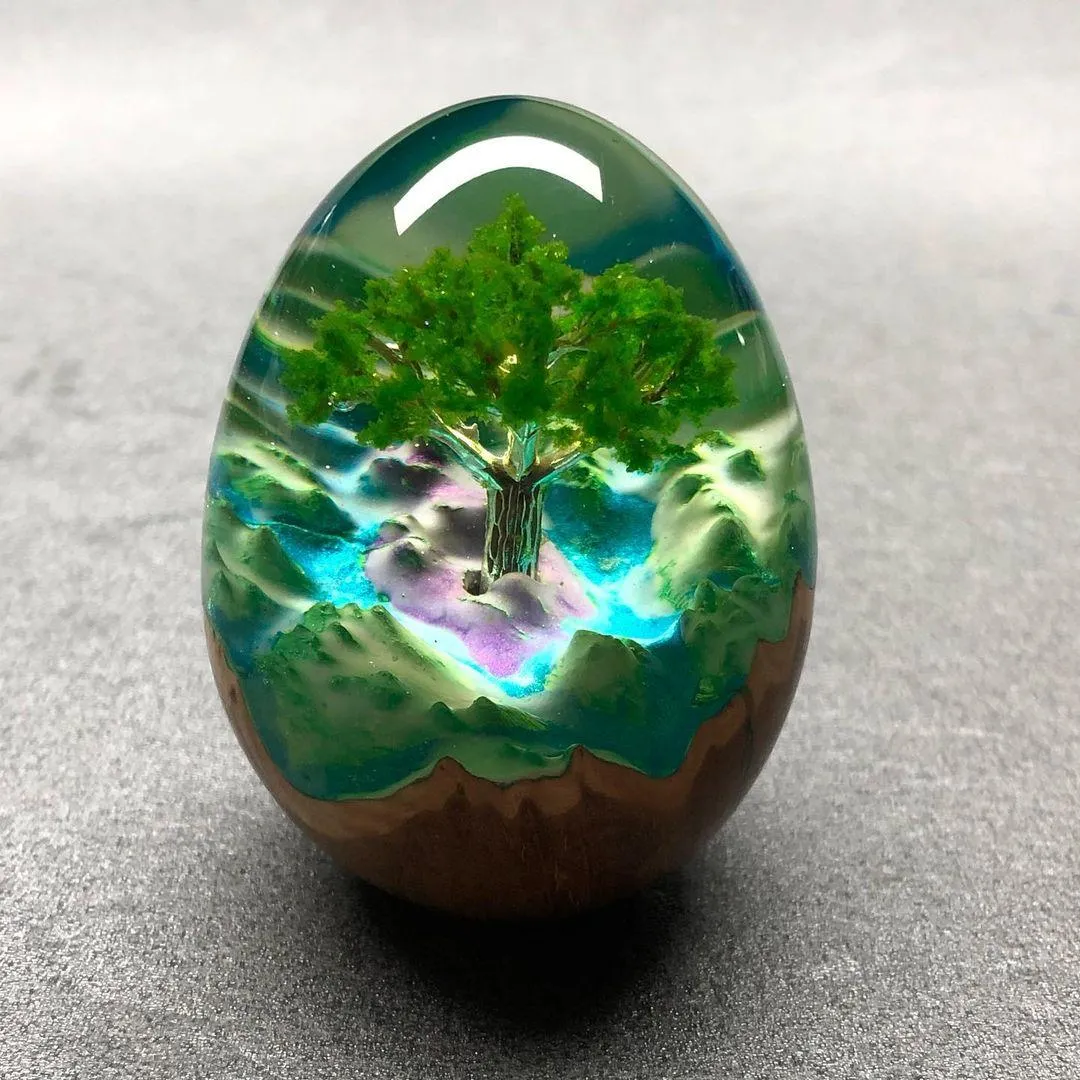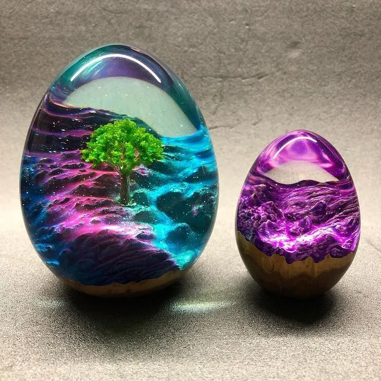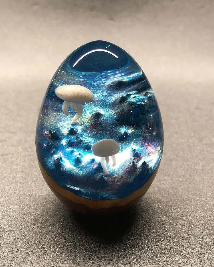 Після висихання він вирізає пластик і починає формувати ідеальну форму яйця за допомогою токарного верстата. По завершенні кожна скульптура "яєць дракона" виглядає як реквізит із фантастичного фільму. Вони ніби мають свою крихітну екосистему чи мініатюрне інопланетне життя.