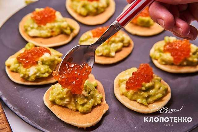 - На основу з мініпанкейків викласти пасту з авокадо та червону ікру. За бажанням прикрасити зеленню кропу.
